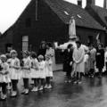 De bruidjes lopen mee met de processie ter ere van de eerste steenlegging van de Fatimakerk.