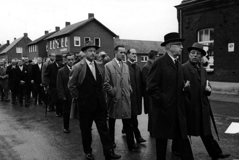 De burgers lopen mee met de processie ter ere van de eerste steenlegging van de Fatimakerk. Vooraan 2de van links: Jac Laumans. Op de tweede rij van links naar rechts: wethouder Sjeng Peeters, wethouder Piet Vincent, gemeentesecretaris Rein Hover.