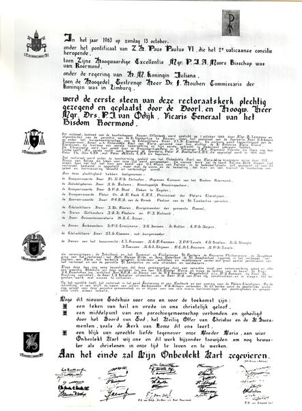 De oorkonde zoals deze in de eerste steen van de Fatimakerk is opgeborgen.