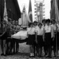 Jong Nederland en het Jonge Meisjes gilde staan rond het Mariabeeld. Op de achtergrond de in aanbouw zijnde toren van de Fatimakerk.