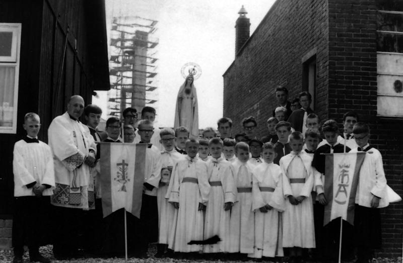 De misdienaars staan samen met rector Weiss rond het Mariabeeld. Op de achtergrond de in aanbouw zijnde kerktoren van de Fatimakerk.