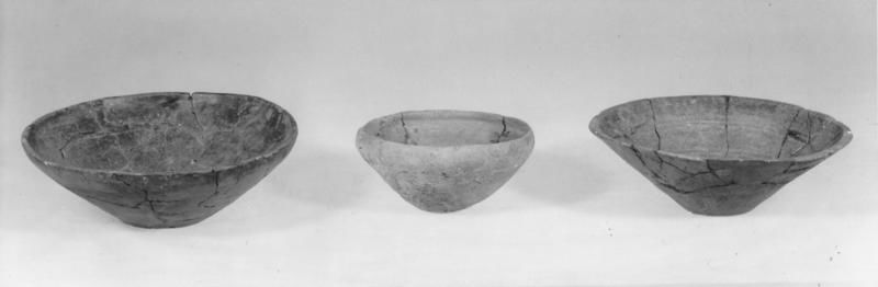 IJzertijd vondsten aan de Hoogstraat in Beesel: l 1915/4.1?; l 1910/3.7; l 1905/4.20? Van links naar rechts: 1. Grauwe deksel, vrij diep; diameter 26 cm; afkomstig uit Beesel en aangekocht van dhr. Hensen te Beesel. 2. Kommetje van laat-Germaans aardewerk; h 8 cm; opgegraven op het land van de heer Hensen te Beesel. 3. Bruine schaal met ingekraste lijnverdiering van binnen, behorend bij een urn; diameter 24,5 cm. Opgegraven onder toezicht van dhr. A. Meijer op het land van dhr. Reijnders te Beesel en van deze aangekocht.