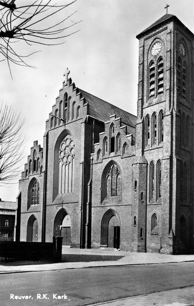 Prentbriefkaart van de R.K Kerk (Lambertuskerk) in Reuver nog met de noodkap op de toren.