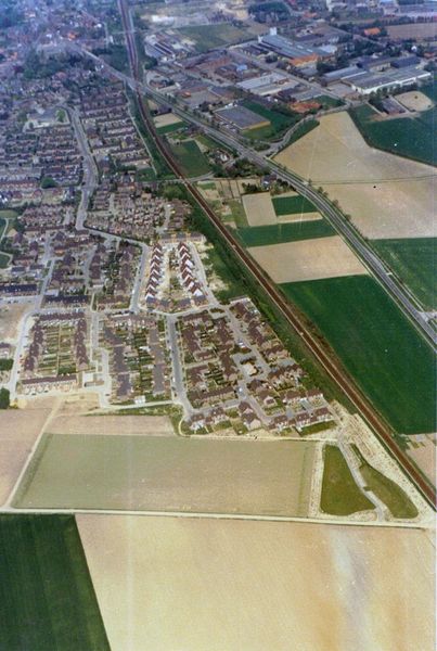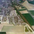 Luchtfoto van een deel van Reuver. Links ligt de nieuwe wijk Leeuwen. In het midden de spoorlijn en rechts het industrieterrein.