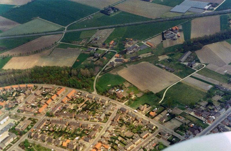 Een luchtopname van Reuver - Offenbeek. In het midden ligt buurtschap Krommenhoek en rechts de "Kale Plak" en bovenin is duidelijk de toenmalige Streekweg te zien.
