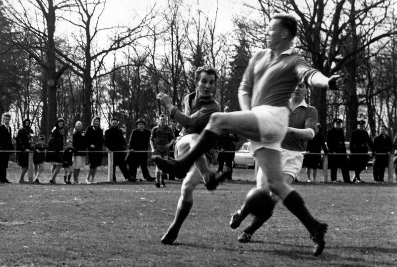 Beeld van een voetbalwedstrijd van voetbalvereniging S.V. Reuver met Joep Gommans in actie.