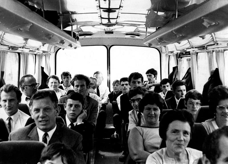 Het voetbalteam A1 van S.V. Reuver samen met de supporters op weg naar Castricum waar ze uiteindelijk kampioen van Nederland werden.