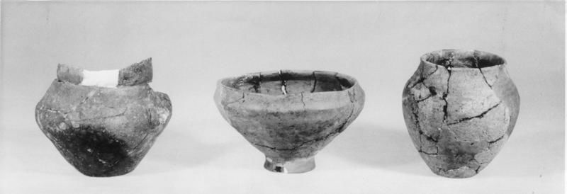 IJzertijd vondsten van het Hensenbos te Beesel: ... ; l 1910/3.1; l 1914/5.3. Van links naar rechts: 1. Germaans urn. Opgegraven onder toezicht van dhr. A. Meijer, op het land van Reijnders te Beesel en van laatstgenoemde gekocht. 2. Urn op voetje, waarschijnlijk laat-Germaans aardewerk; h 15,5 cm. Wijde opening; opgegraven op het land van de heer Hensen te Beesel. 3. Slanke urn van rossig geel aardewerk, La Tüne-vorm; h 21 cm. Van boven met een rij ingedrukte lijnversiering.