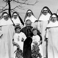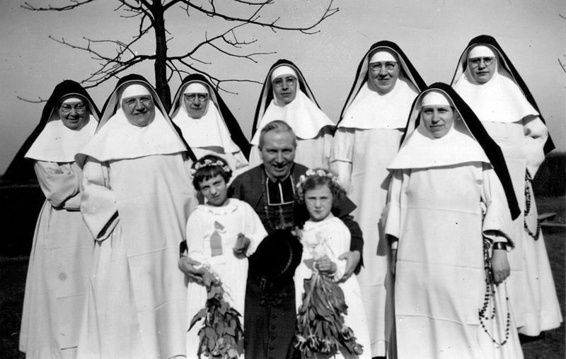 Van Links naar rechts: Zr. Eugenia, zr. Adeltruda, zr. Cleta, Zr. Ursuline, zr. Maria-Vincentia, zr. Carissima, zr. Cypriana (het kleine zustertje van de bewaarschool). Vooraan: José Bosmans mgr. Lemmens, Mia Bosmans.