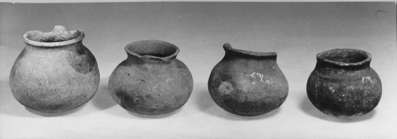 Van links naar rechts: 1. Saksisch kogelpotje; h 12,2 cm. Gevonden op Duits grondgebied. Aangekocht van dhr. J.W. Ueberbach te Helden. 2. Vroeg-middeleeuws kogelpotje; h 10 cm. Aangekocht van dhr. J.W. Ueberbach te Helden. 3. Kogelpotje; h 11 cm. Aangekocht van dhr. J.W. Ueberbach te Helden. 4. Vroeg-middeleeuws kogelpotje; h 10,5 cm. Aangekocht van dhr. J.W. Ueberbach te Helden.