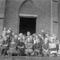 Een schoolklas bij een groepsfoto voor de Sint Lambertus kapel.
