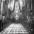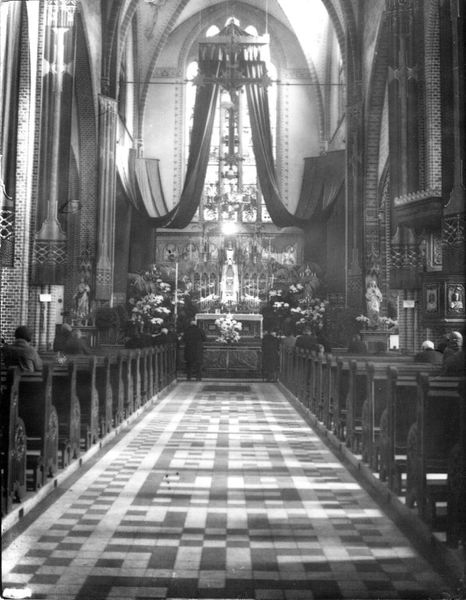 Het interieur van de Sint Lambertuskerk met de oude preekstoel uit de 18e eeuw (uit Thorn) bij het 100-jarig bestaan van de parochie Sint Lambertus in 1934.