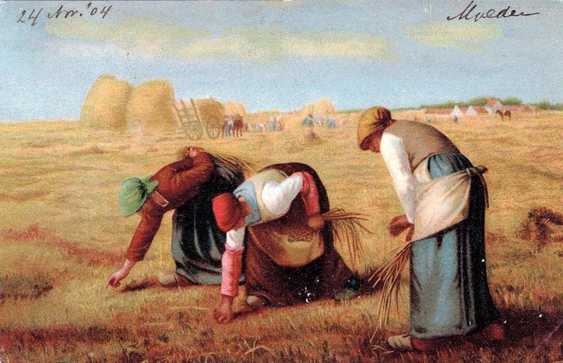 Prentbriefkaart met hierop een schilderij van enkele dames die aan het zeumeren zijn wat zoveel betekent dat ze de aren verzamelen die zijn achtergebleven na het maaien.