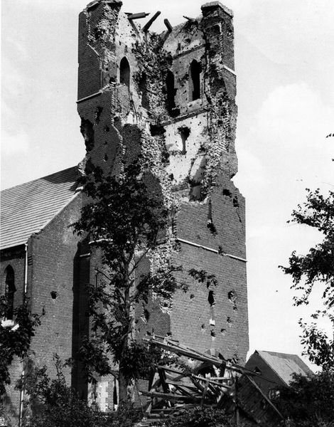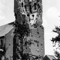 De zwaar beschadigde Sint Gertrudiskerk uit Beesel direct na de oorlog in 1945.