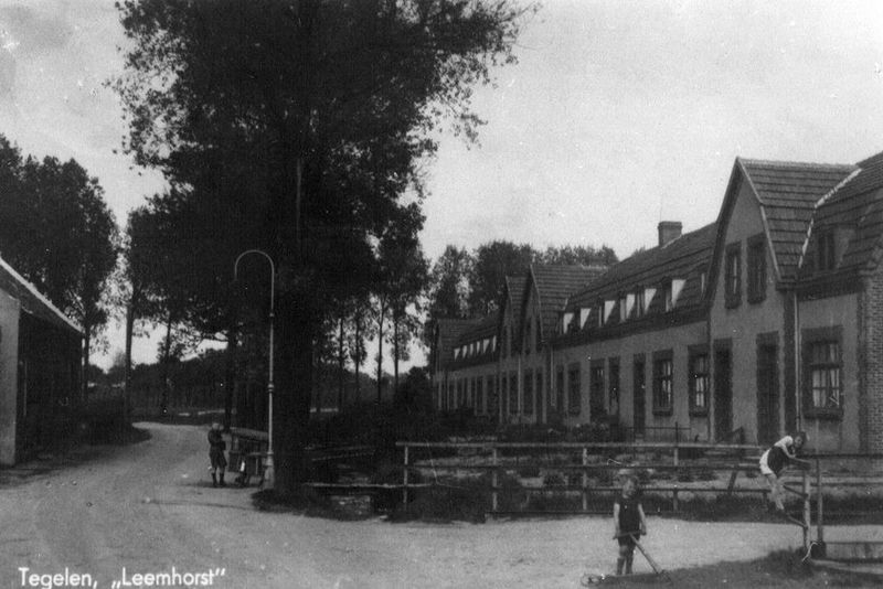 Prentbriefkaart met hierop de de rij woningen bekend onder de naam Twaalf apostelen op Tegels grondgebied in de Leemhorst bij Geloo.