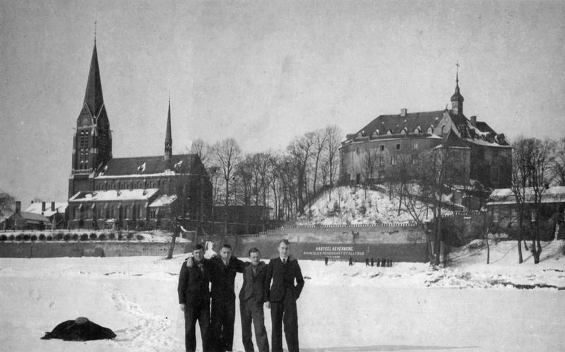 Vier heren op de bevroren Maas met op de achtergrond de Onze Lieve Vrouw Geboorte Kerk en kasteel de Keverberg in Kessel.