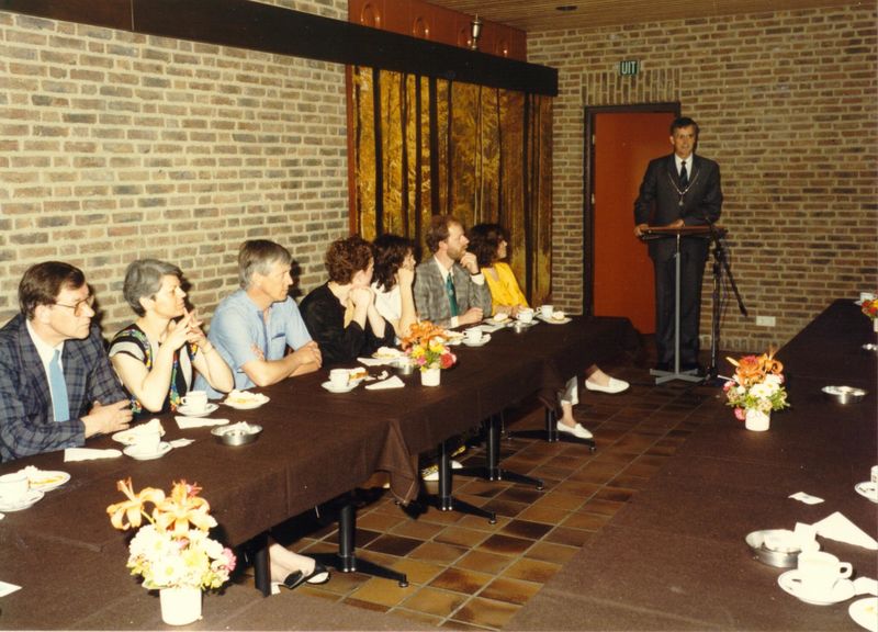Burgemeester Nuytens spreekt de bezoekers toe bij de opening van de tentoonstelling "Stads- en Dorpsvernieuwing".