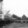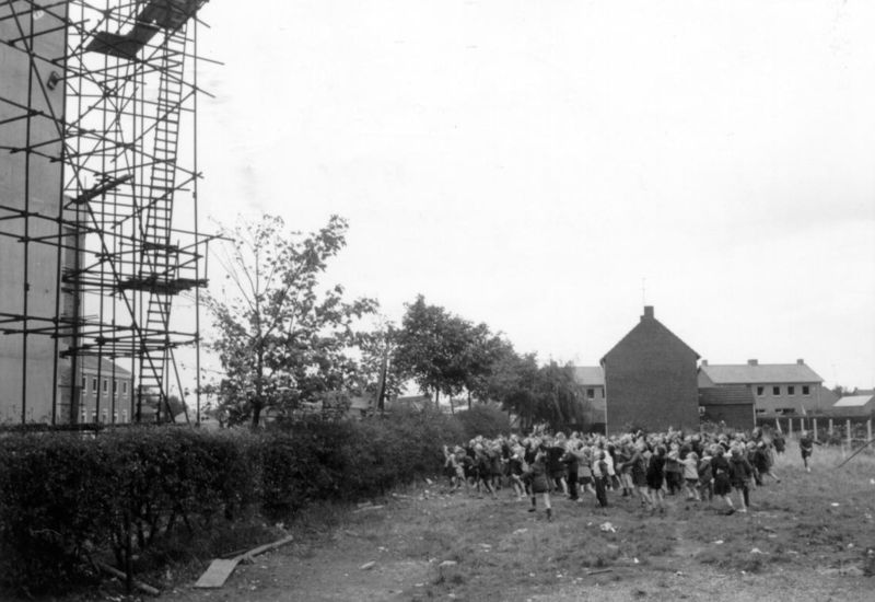 Richtfeest bij het bereiken van het hoogste punt van de Fatimakerk in aanbouw te Offenbeek.
