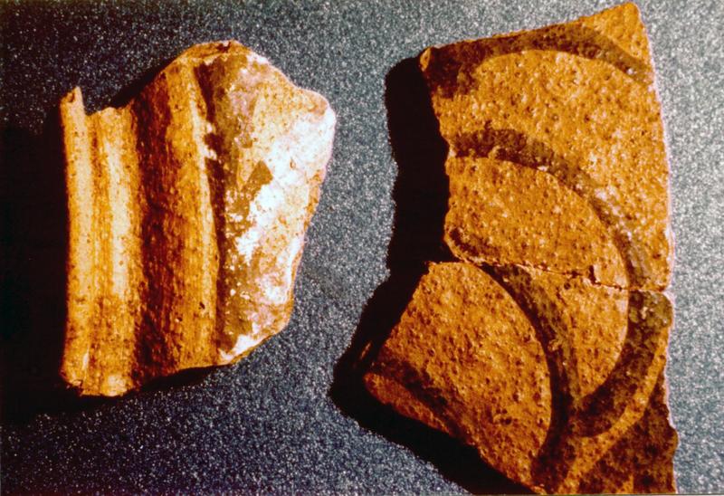 Proefopgraving van een Romeinse villa bij de Solberg (aan de Bovenste Solbergweg) 1978. Rand en buikfragment van een pot met opgelegde lijnversiering.