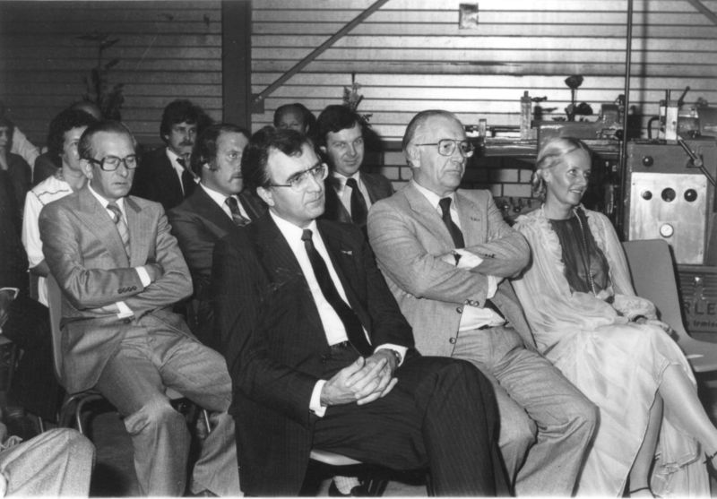 Opening bedrijfshal Mifa aan de Bergerhofweg. Aandachtig luisteren de genodigden naar een toespraak van directeur J. Aalberts, op de voorgrond. v.l.n.r. wethouder P.J. Vincent, Gouverneur J. Kremers en burgemeester J.T. Hendrix.