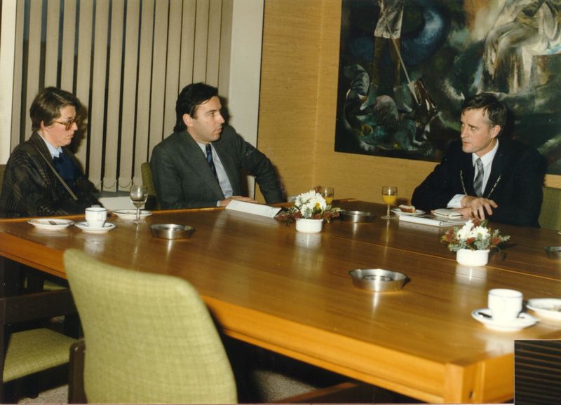 Bezoek minister W.V.C., L.C. Brinkman, aan de gemeente Beesel. v.l.n.r. Mevr. Nuytens, minister Brinkman, burgemeester Nuytens.