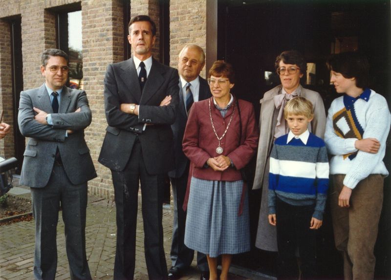 Installatie drs. C.A.C.M. Nuytens tot burgemeester. De heer Nuytens luister aandachtig naar het Trommel- en fluiterkorps St. Barbara. v.l.n.r. gemeentesecretaris Hermsen, de heer Nuytens en wethouder Heldens, mevr. van Dijk-Theunissen, mevr. Nuytens en de kinderen Stefanie en Gabriëlle.