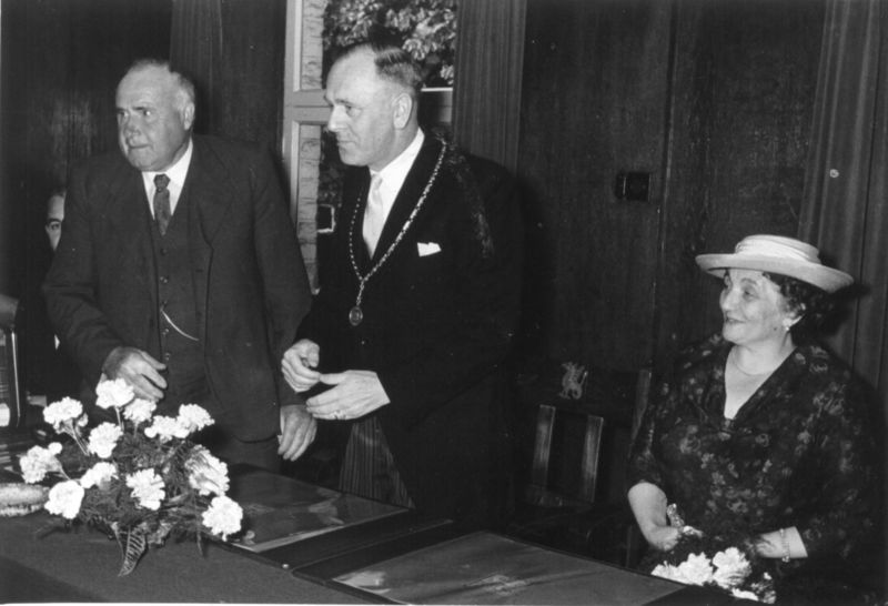 Viering 25-jarig ambtsjubileum van burgemeester J. Mooren. v.l.n.r. wethouder J. Steeghs, burgemeester J.TH. Mooren en echtgenote.