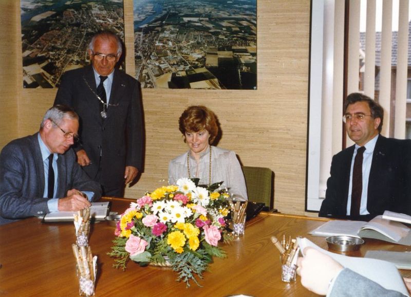Ambtelijk werkbezoek gouverneur J. Kremers. v.l.n.r. Griffier Gudde, burgemeester J.T. Hendrix, mevr. Kremers, gouverneur Kremers. Plaats: commissiekamer gemeentehuis.