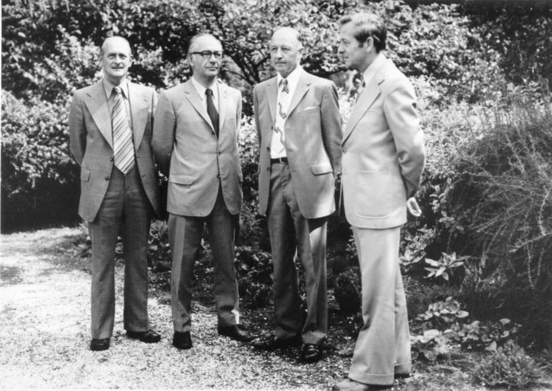 College van Burgemeester en Wethouders periode 1970-1974. v.l.n.r. R.E.C. Hover, Secretaris. J.T. Hendrix, burgemeester, J.A.H. Peeters, wethouder en P.J. Vincent, wethouder. Foto genomen in de tuin van de zusters aan de Pastoor Vranckenlaan.