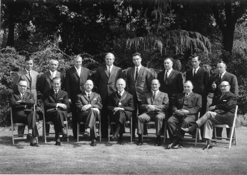 Van links naar rechts: 1 J. Janssen, 2 H. Driessen, 3 C. Vaessen, 4 F. Heldens, 5 J. Laumans, 6 W. Thijssen, 7 J. Levels, 8 A. Teunissen, 9 H. Geraeds, 10 P. Vincent, 11 J. Peeters, 12 J. Mooren (burgemeester), 13 R. Over (secretaris), 14 M.Smeets, 15 G. Cremers.