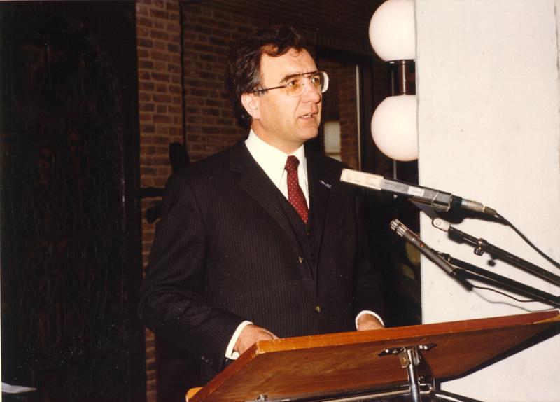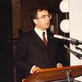 Officiële opening van het nieuwe gemeentehuis op 19 april 1980. Gouverneur Kremers tijdens zijn openingswoord.