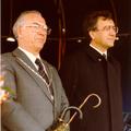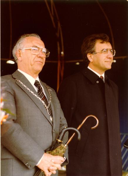 Officiële opening van het nieuwe gemeentehuis op 19 april 1980. Op de markt kijken Gouverneur Kremers en burgemeester Hendrix naar de festiviteiten, die op de markt plaatsvinden.
