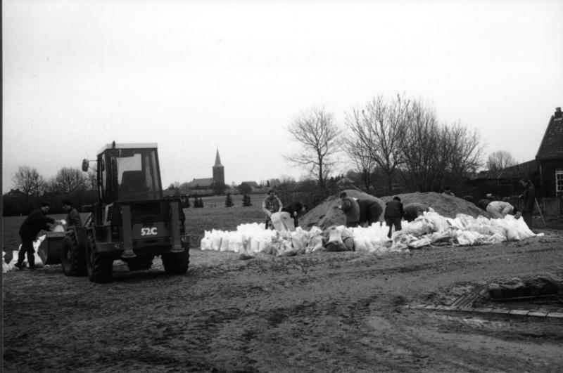 Hoog water in de winter 1993 - 1994. Zandzakken vullen voor de dijk versteviging.