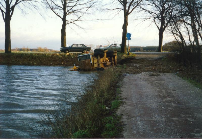 Tijdens hoog water in de winter van 1993 - 1994 kiepte deze graafmachine in de lager gelegen greppel.