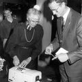 Burgemeester Nuytens met mevr. D. de Graaf Nauta. Mevr. D. de Graaf Nauta zet frankeermachine van de gemeente Beesel in bedrijf. 2-12-1987.