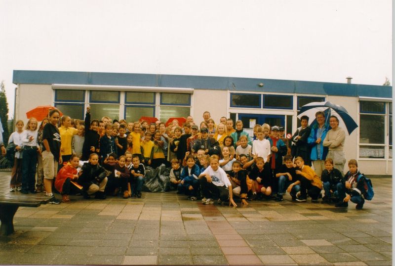 De complete groep kinderen (88 leerlingen) van basisschool Offenbeek omringen het door hen verzamelde afval.