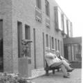 Bankzitters voor het gemeentehuis te Reuver o.a. dhr. Rovers en dhr. v. Densen; ca 1990. Voorgrond het monument van de Windjbuul van Nicolas v. Ronckenstein.