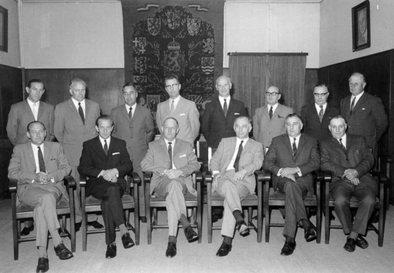 Gemeenteraad Beesel in 1956. Boven van links naar rechts: Levels, C. Vaassen, Janssen, J. Laumans, Mat Koch, J. Cremers, H. Geraets, F. Heldens. Beneden van links naar rechts: R. Hover, P. Vintcent, J. Peeters, burgemeester Hendrix, W. Thijssen, M. Smeets.