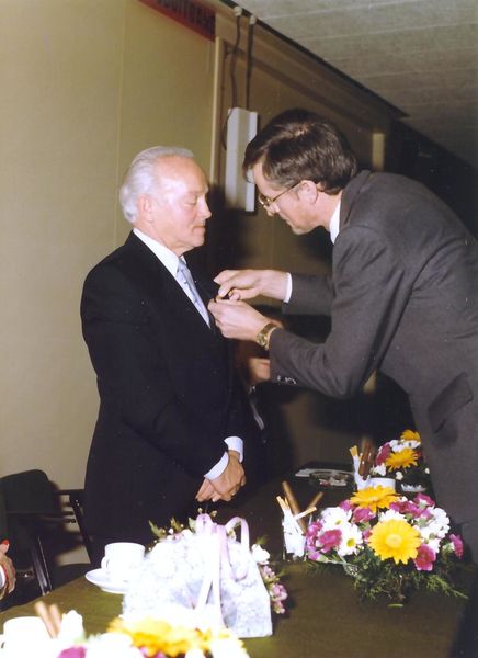 Koninklijke onderscheiding uitgereikt aan P. van Lier door burgemeester Nuytens.