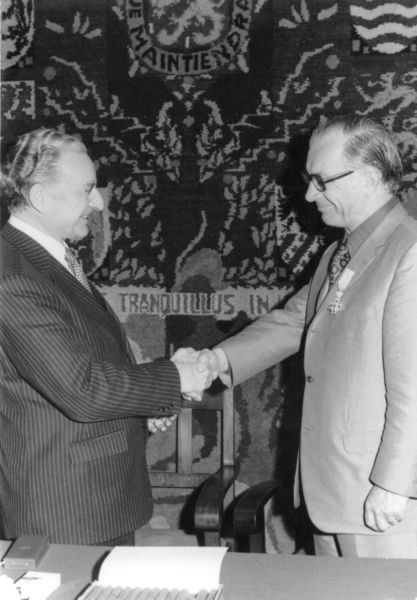 Uitreiking onderscheiding "Ridder in de orde van Oranje Nassau" door gouverneur Van Rooy op 29 april 1975 i.v.m het 40-jarig dienstjubileum van burgemeester J.T. Hendrix.