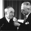 Uitreiking van koninklijke onderscheiding van de heer Pierre Lankes (baas bij Teeuwen) op 26 febr. 1949, door burgemeester Claessen.