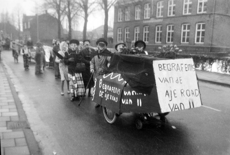 Carnavalsoptocht 1992 in Reuver. De ‘Begrafenis van de aje road van 11’ werd uitgebeeld naar aanleiding van het vertrek van een groot aantal raadsleden..