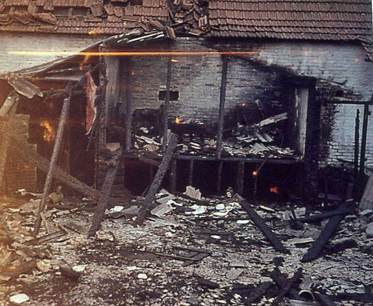 Het HK (hoofdkwartier) van de verkennersgroep Sint Lambertus werd begin zestiger jaren door een brand getroffen. Dit bleef er over. Op de achtergrond het Jeugdhuis en nog zichtbaar de nesten van de welpen en de hut van de senioren verkenners.