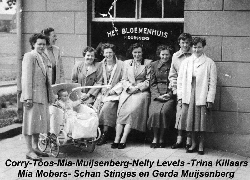 Enkele dames poseren voor het Bloemenhuis op de Pastoor Vranckenlaan (later zat hier de schoenwinkel van Dorssers) in Reuver.