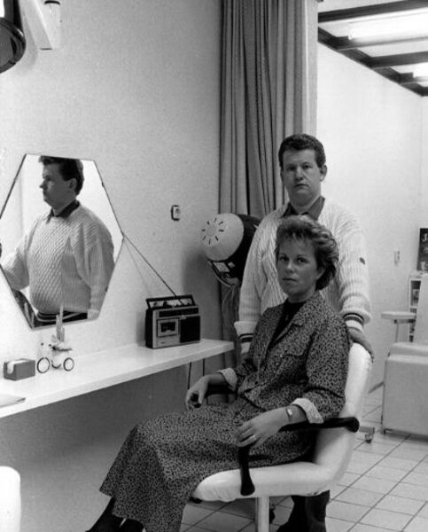 Ton Steeghs (zoon van Thei Steeghs - Neutje ) poseert samen met zijn vrouw Loes in hun kapperszaak.