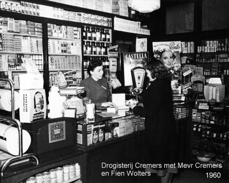 De drogisterij van Cremers inn Reuver met links mevrouw Cremers en rechts Fien Wolters.