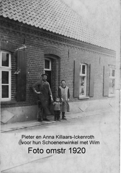Peter en Anna Killaars - Ickenroth staan samen met hun zoon Wim voor hun schoenwinkel.