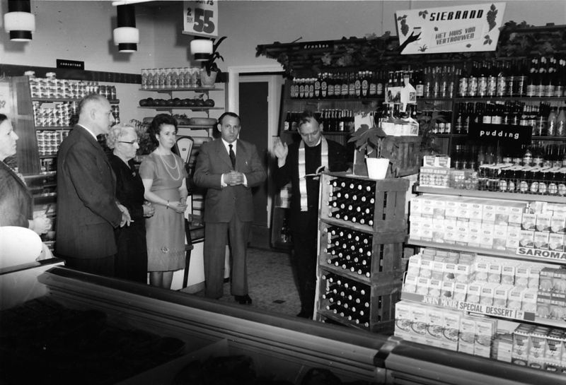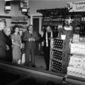 Van links naar rechts: Mevrouw Jo Teunissen - Houba ( vrouw van Jan), Jan Teunissen, oma Teunissen - Smits, mevrouw Teunissen ( vrouw van Drè) , Drè Teunissen. Pastoor v.d. Broek zegent de nieuwe winkel in.