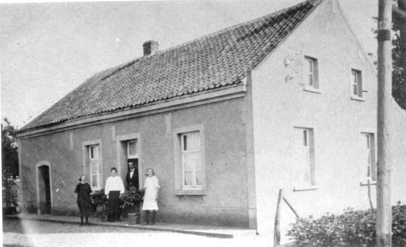 Huis Heldens in de Groenstraat ca 1924. Van links naar rechts: Mien Teeuwen, Petronella Heldens, Wijnand Janssen, Petronella, de verloofde van Janssen. Wijnand Janssen is de vader van Pierre Janssen.