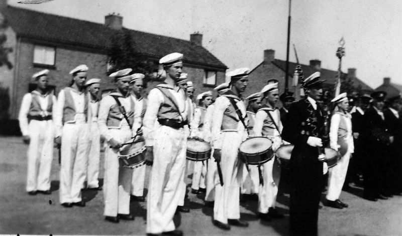 Het trommel- en fluitenkorps St. Barbara tijdens een optreden in Offenbeek met tamboer-maître Baér Dorssers
